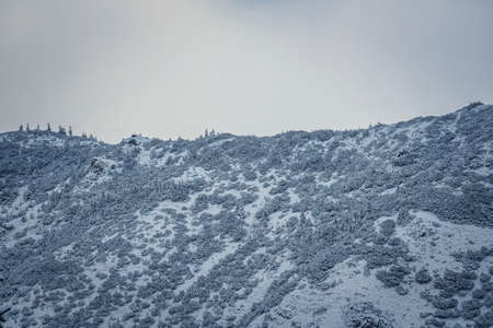 Mountain ridge closeup, Tatra National Park, Poland. Small pines growing on a steep slope, thin layer of snow covering the hill. Selective focus on the horizon, blurred background.