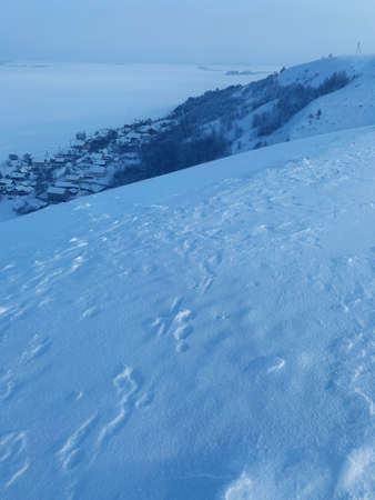 Winter landscape with snowy mountains, shelter and valley with blue sky, sunset. Old houses, fences and paths. Village Putivsk, Chernigov olast, Ukraine