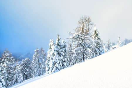 Winter landscape with snow covered trees and mountains in the background, horizontal