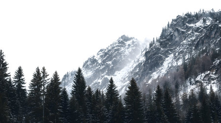 Winter landscape with snowy mountain with coniferous forest and pointy pinnacle with trees on top in haze. Atmospheric alpine scenery with firs on hillside. Spruces on snow mountain and sharp rocks.