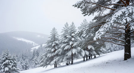 Experience a tranquil winter landscape with lush pine trees blanketed in soft snow, enveloped by fog and majestic mountains, capturing nature's serene beauty.