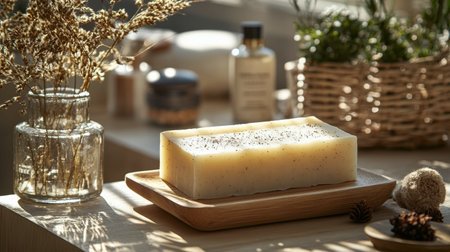 Handmade soap sits on a wooden plate, bathed in soft natural light. Nearby, fresh lemon slices add a touch of color, enhancing the serene and inviting atmosphere.