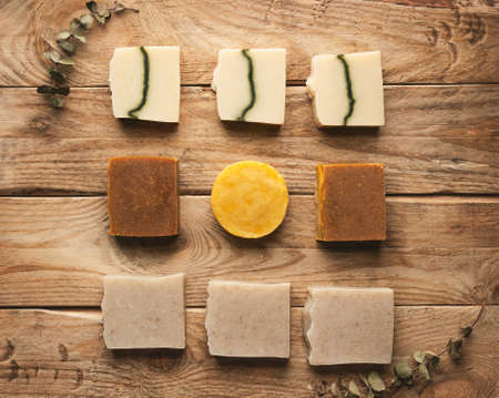 Eco friendly handmade soap bars on wooden background. Made with organic ingredients.
