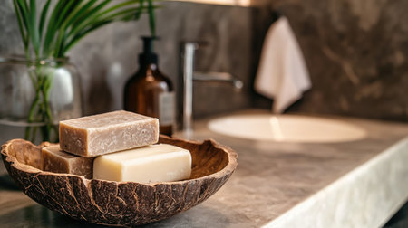 A serene bathroom scene featuring natural soap bars arranged in a wooden bowl, complemented by a green plant and a sleek sink, perfect for wellness and relaxation.