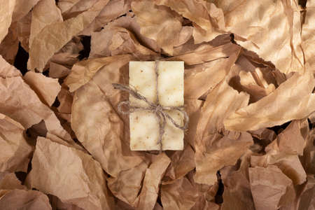 Natural handmade organic soap on multiple pieces of torn brown craft paper background, top view. Zero waste, eco friendly vegan soap bar