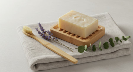 A minimalist and serene composition of sustainable self-care items, including a natural bar soap, a bamboo toothbrush, lavender, and eucalyptus sprigs on a linen towel. This clean visual symbolizes an eco-friendly, plastic-free, and zero-waste lifestyle, as well as personal care with natural ingredients. Ideal for themes of sustainability, wellness, and conscious consumerism.