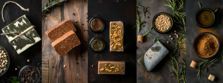 A top-down view of assorted natural soaps, herbs, and spices arranged on a dark rustic background. The combination of textures and earthy tones gives the image a warm, artisanal feel, ideal for organic skincare and wellness content.
