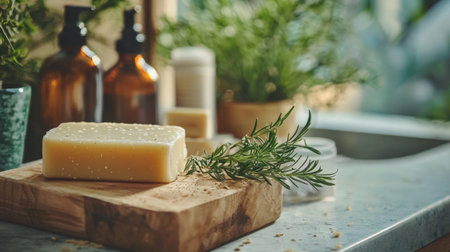 A bar of handmade soap with natural rosemary on a wooden board, surrounded by greenery and glass bottles, symbolizing natural skincare and sustainability.
