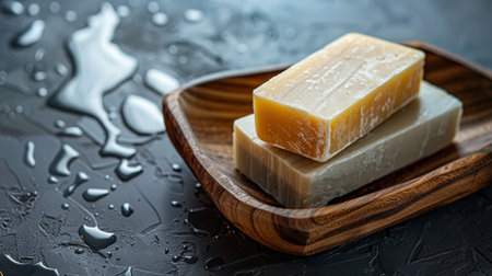 Close-up of handmade natural soap bars placed on a wooden dish, surrounded by water drops on a textured gray surface.