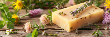A bar of soap is sitting on a wooden table with flowers and herbs surrounding it. The soap is yellow and has a lavender scent. The flowers and herbs give the image a natural and calming feel