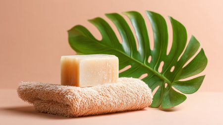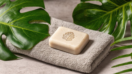 A serene image of a natural soap bar resting on a soft towel with rich tropical leaves, ideal for highlighting beauty, wellness, and relaxation themes.