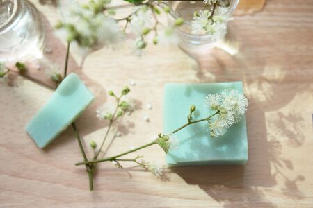 green blue home made soap and white nature flower on wood background organic health wellness skin care concept
