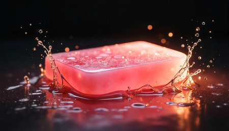Wet pink soap bar with splash on reflective surface