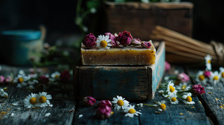 Rustic soap bar with dried roses and chamomile flowers, portraying a natural, artisanal product for skincare and wellness.