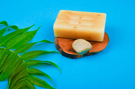 Natural spa soap on wood. Bar of handmade soap.