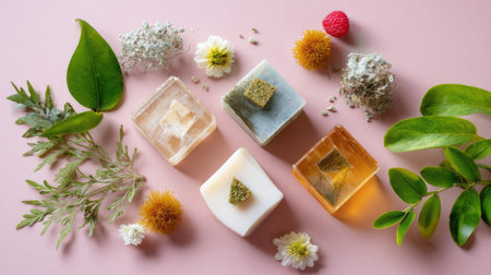 A visually appealing arrangement of natural soap bars surrounded by herbs, flowers, and berries. This vibrant composition emphasizes beauty, wellness, and organic ingredients, perfect for marketing skincare products.