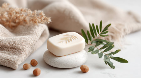 A serene composition featuring a bar of natural soap resting on a soft towel alongside a vibrant green leaf, creating a soothing atmosphere perfect for spa and wellness themes.