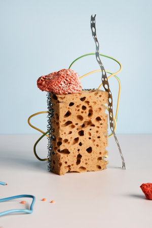 yellow and orange sponge with wire on white, blue background. still life , creative, minimal, contemporary and art concept. balance composition