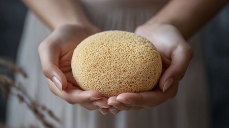 Close up of woman hands holding natural sponge. Natural body care concept.