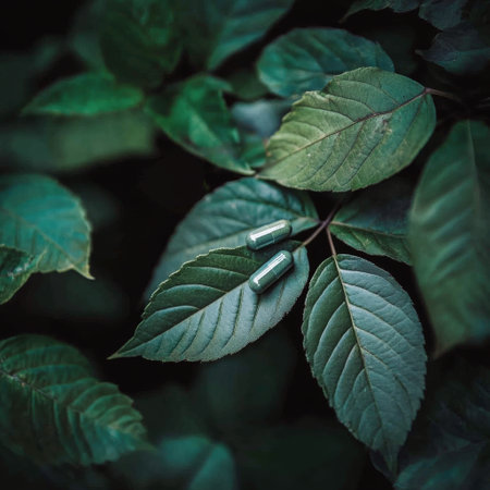 Herbal supplement capsules arranged on a bed of lush green leaves.