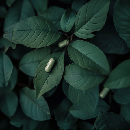 Two green capsules rest on vibrant green leaves, highlighting a blend of nature and health. The serene atmosphere enhances the connection to plant-based wellness.
