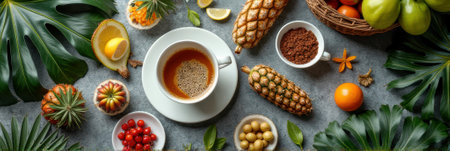 Tropical coffee break: exotic fruits, fresh leaves, and aromatic coffee spread. That the image is generated using AI.