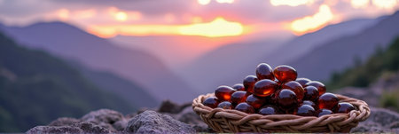 Basket of shiny brown stones on mountain rocks at sunset. That the image is generated using AI.