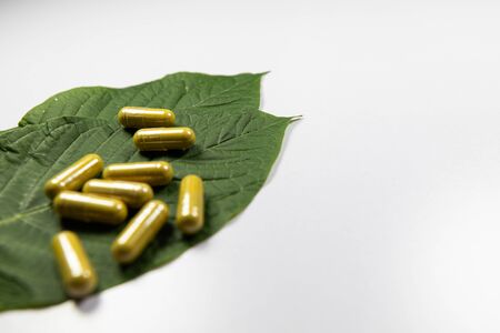 Alternative medicine herbal organic capsule drug with herbs leaf natural supplements for healthy good life.