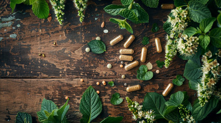 Natural herbal supplements scattered amongst fresh green leaves on a rustic wooden background.