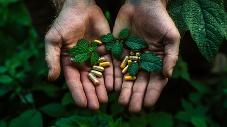 A man holds a handful of pills in his hands on a background of green leaves