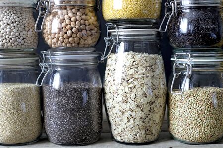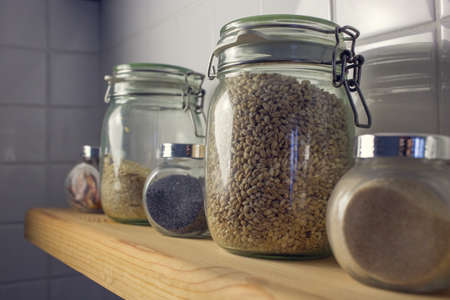 Close up of cereals in cans on shelf. Raw pasta products in glass jars in kitchen