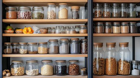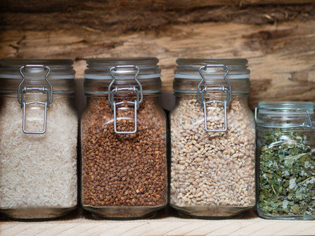 Wooden shelves in pantry for food storage, grain products in storage jars.