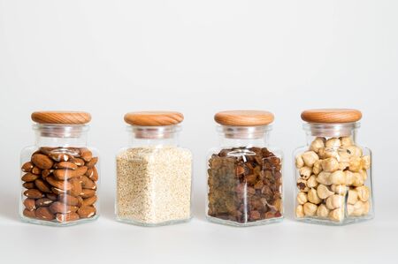 Close up, macro. A set of kitchen glass jars in half a turn. Inside contain raisins, sesame, hazelnuts, almond. White background. Copy space.