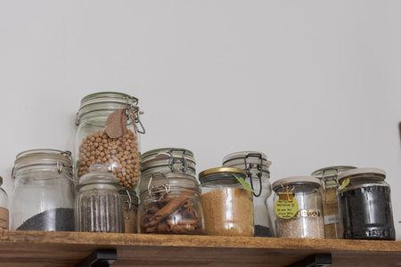 Stocked kitchen pantry. Shelves with different cereals in jars on white wall background with space for text. Different seeds and cereals in glass containers. Food storage