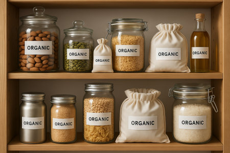 Organic products on shelves featuring jars and bags with nuts, grains, beans, and oil bottle for healthy eating and eco-friendly storage.