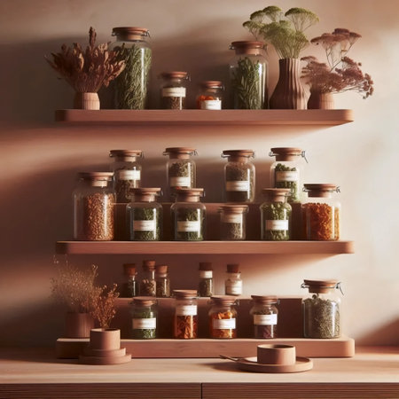 Glass Jars of Assorted Organic Freeze-Dried Foods on Wooden Shelf. Glass jars filled with various dried fruit, Raspberries, herbs and seeds, showcasing an organized pantry setup.