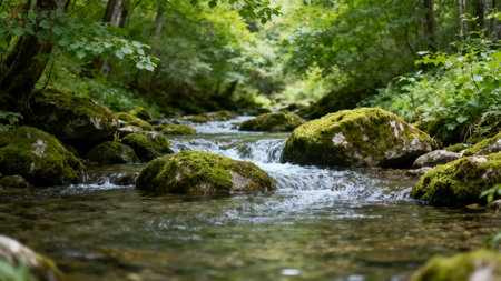 A tranquil stream flows gently over moss-covered rocks, creating a serene and refreshing atmosphere. The sparkling water reflects sunlight, highlighting nature's beauty.