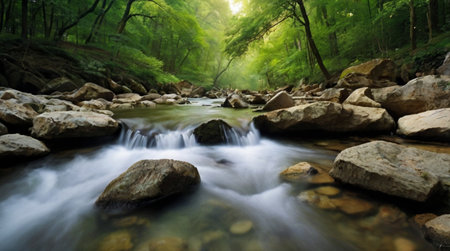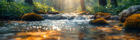 Gentle stream cascades through a sun-drenched forest, creating a tranquil scene. Rocks peek out from the flowing water, reflecting the surrounding verdant landscape.