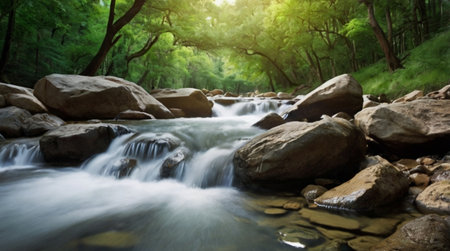 Experience tranquil nature scene with a sun-drenched stream gently cascading through a vibrant green forest.