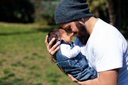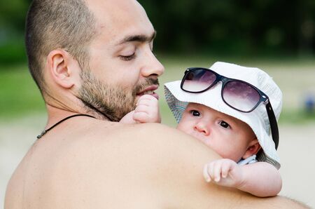 Happy young father hugging and kissing his sweet adorable newborn child.