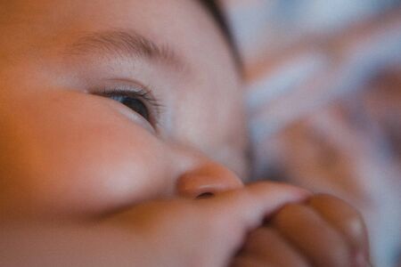 Portrait of a blue-eyed 6 months baby girl with finger in mouth