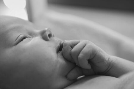 newborn babys face close up: eyes, nose, lips. concept of childhood, health care, IVF, hygiene, ENT
