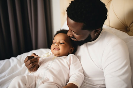 African American father smiles feeding little toddler son with milk cereal from spoon. African American father spends time with baby feeding with spoon of delicious food for kids. Family spends time