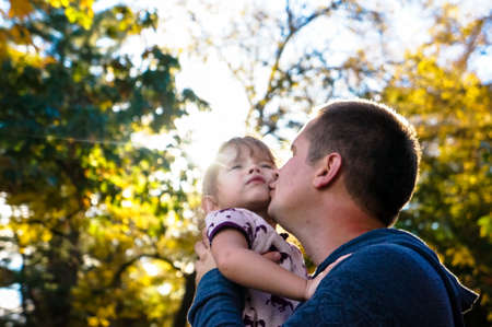 Happy man kissing his little baby girl walking outdoors. Father holding daughter wearing fall brown sweater and yellow hat