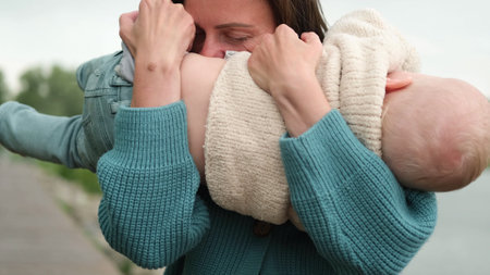 Young Mother Tenderly Lifting and Kissing her Baby Boy Backlit by Bright Sunlight Outdoors in Family, Love and Togetherness Themed Image.
