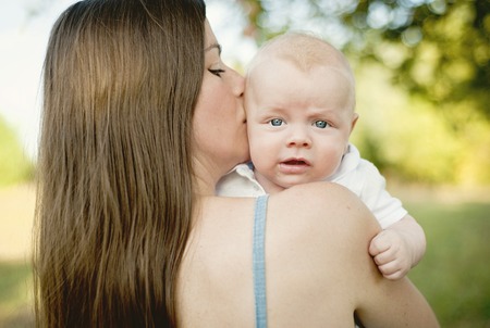 Cute baby with light hair, wearing a striped jacket, looking at the camera with a gentle smile, held by a woman kissing his head.