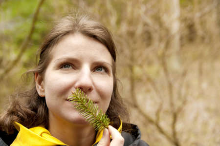 Woman enjoying the fresh scent of forest leaves while exploring nature