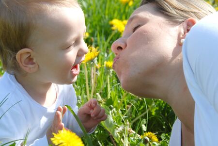 Mom holds daughter on hands. They stand in a meadow. Mother kissing daughter