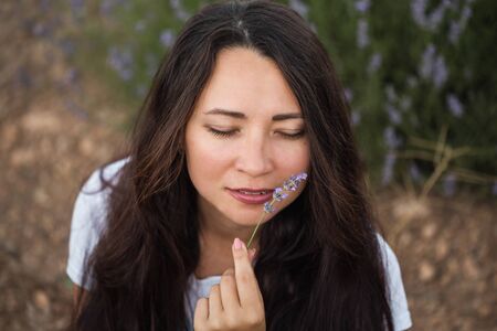 Head and shoulders portrait of woman with long dark hair smelling lavender with closed eyes