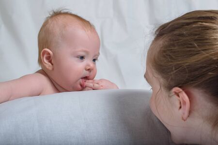Cute baby looks at his mother. Sister and younger brother. Kid sucks fingers.